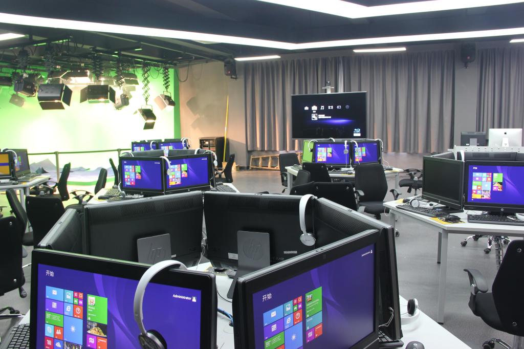 8.全媒体创意实验室。该实验室位于实验楼E410,该室分为摄影、摄像、制作及展示区。实现虚拟仿真环境下的“采、编、摄、制、播”,实现“Studio”与“Lab”功能的集合,建立跨专业一体化综合实践平台。