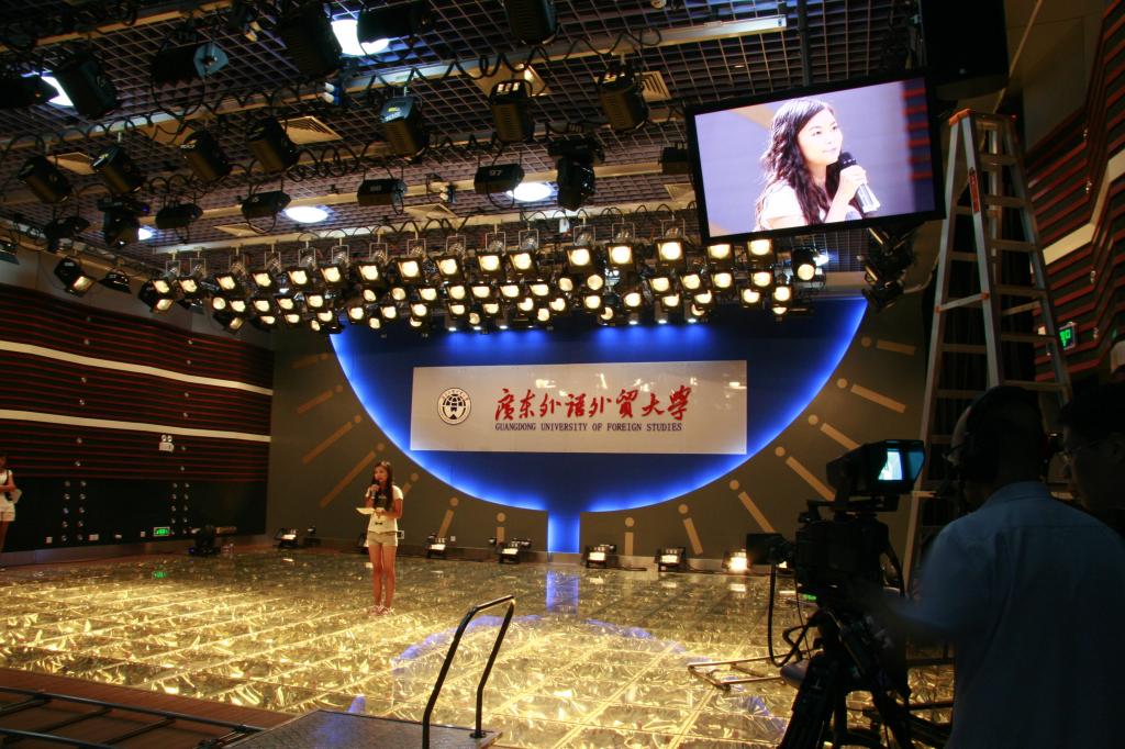 4.演播厅。该室位于南校区实验室E507,配置三讯道数字标清演播室,采用全数字化摄录设备及系统流程,系统包含前后期视频拍摄、制作及节目的上载和转码。