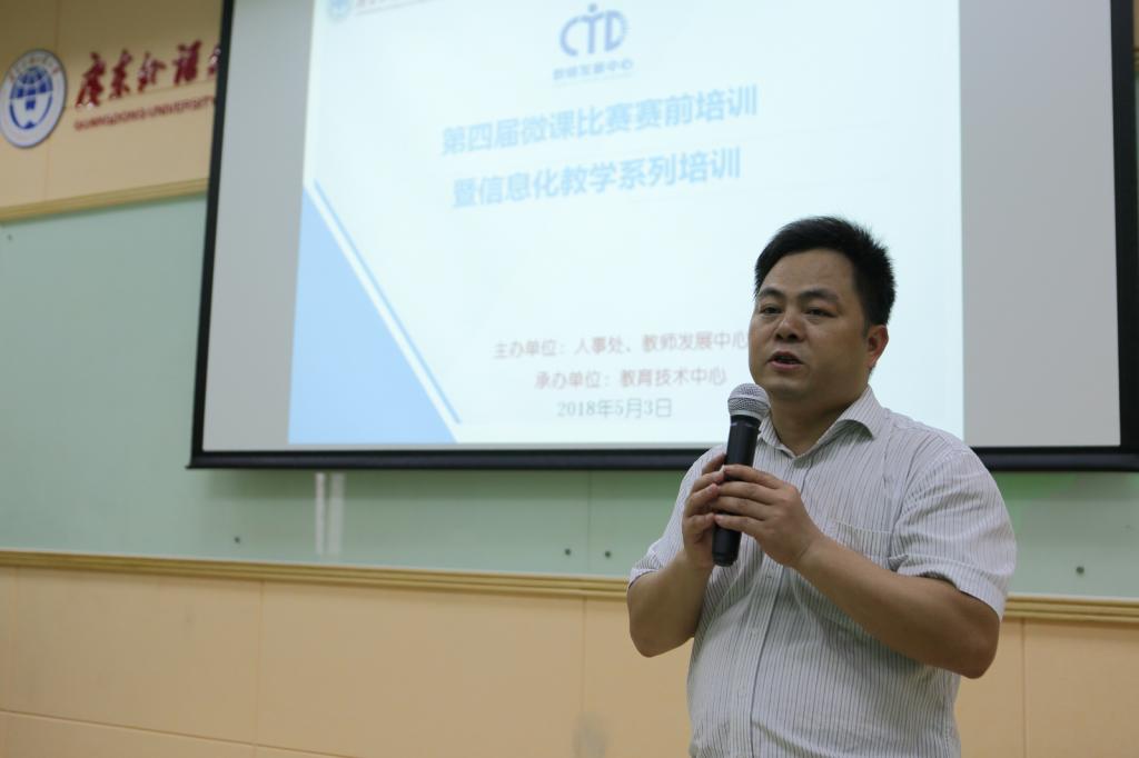 2018年5月3日下午,由教师发展中心、教务处和教育技术中心联合举办的第四届微课比赛赛前培训暨信息化教学系列培训在六教B315虚拟仿真实验室顺利举行。本次培训邀请了邀请第三届微课比赛一等奖获得者古煜奎、欧阳倩华和郑煜诗以及教育技术中心音像技术实验室副主任郭子儒四位老师做赛前指导和经验分享,人事处处长谢文新教授及来自学校各学院50多位的老师和学生助理参加了此次培训。