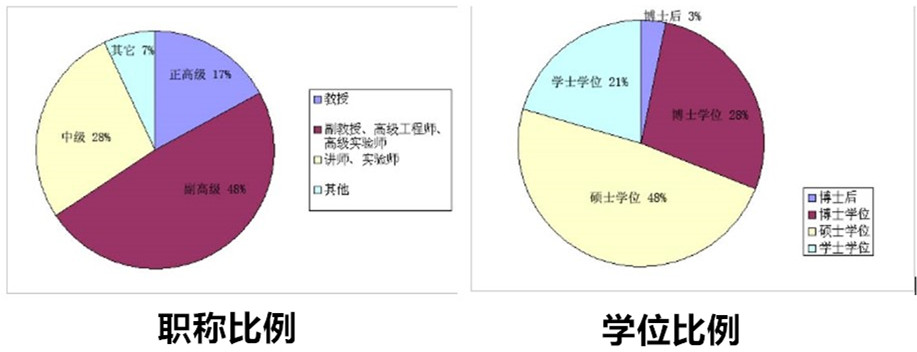 中心在编教师总人数29人。其中,教授5人,占17%;副教授、高级工程师、高级实验师14人,占48%;讲师、实验师8人,占28%,其他2人,占7%。 具有博士后1人占3%人,博士学位8人占28%,硕士学位14人占48%,学士学位6人占21%